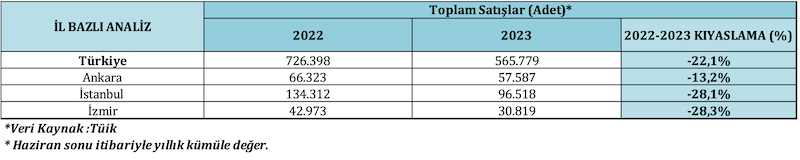 İstanbul, İzmir ve Ankara özelinde bakacak olursak; 2023 Haziran sonu itibariyle kümüle konut satışlarının, 2022 yılı aynı dönemine nazaran İstanbul’da yaklaşık % 28,1 İzmir’de %28,3 ve Ankara’da ise %13,2 oranında azaldığı görülmektedir.