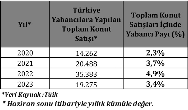 2023 yılı Haziran ayı sonu itibariyle yabancılara yapılan konut satışlarına baktığımızda bir önceki yılın aynı dönemine göre satışlar %69,6 oranında azalarak toplam 2.625 adet açıklandı. 2023 yılı Haziran ayı sonu itibariyle yabancıya satılan kümüle konut adedinin toplam satışlar içindeki oranı %3,41 oranındadır. 2022 yılı aynı döneminde bu oran %4,87’ydi.”