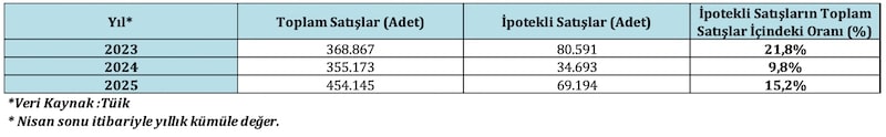 2025 yılı Nisan ayı sonu itibariyle gerçekleşen kümüle konut satışlarının içinde ipotekli satışların oranı %15,2 mertebelerinde gerçekleşti. 2024 yılı Nisan ayında bu oran aynı etkilerden dolayı %9,8 seviyelerindeydi.