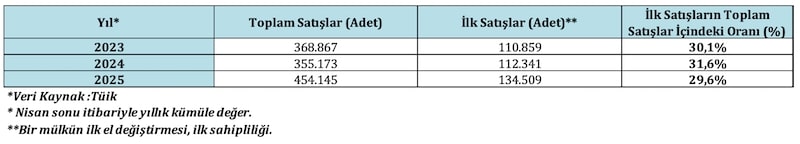 Bir başka önemli veri de ilk satışlar, 2025 yılı Nisan ayında gerçekleşen ilk el konut satışları bir önceki yılın aynı ayına göre %43,79 oranında artarak 34.633 adet açıklandı. 2025 yılı Nisan ayında, toplam konut satışları içinde ilk el konut satışlarının payı %29,62 olarak gerçekleşti.