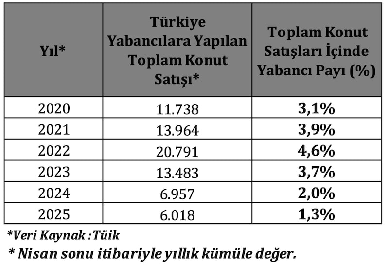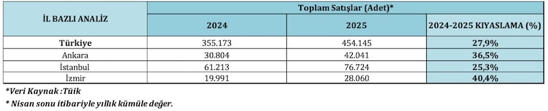 2025 yılı Nisan ayında ilk sırayı 529 adet konut satışı ile İstanbul aldı. İstanbul’u sırasıyla 497 adet konut satışı ile Antalya ve 117 konut satışı ile Mersin izledi.