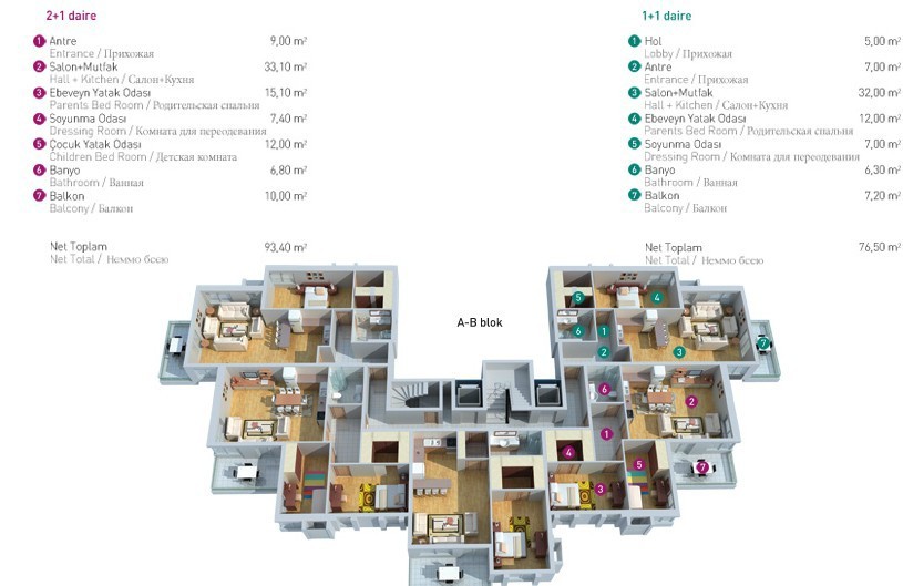 Maviler İnşaat 242 Park projesinde 1 oda 1 salon daireler net 76 metrekare, 2 oda 1 salon daireler net 93 metrekare olarak belirlendi.
