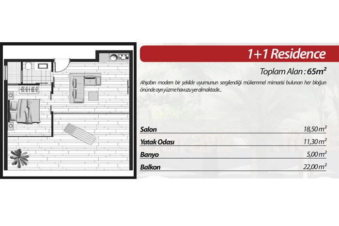 - Mobilyalı olarak teslim edilen 1 oda 1 salon daireler üst katlarda yer alıyor.