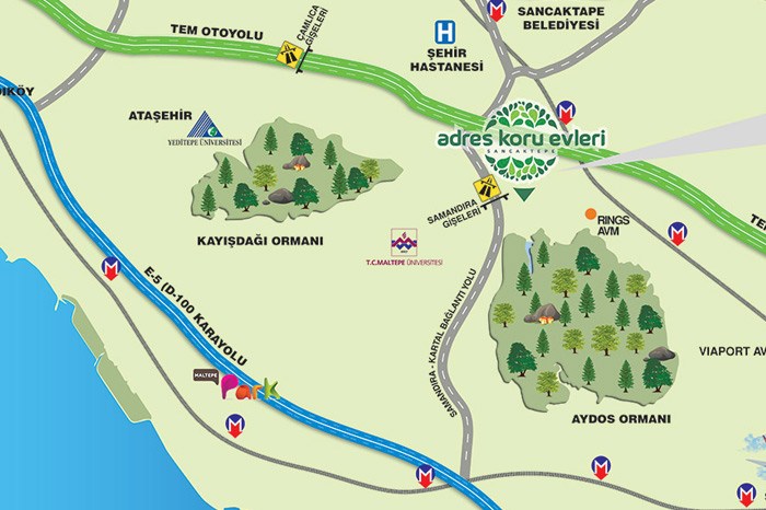 Adres Koru Evleri, şehir hastanesine 1.5 kilometre, yeni belediye binasına 2 kilometre, Maltepe Üniversitesi'ne 2.5 kilometre, Aydos Ormanı'na 4 kilometre, Yeditepe Üniversitesi'ne 6.5 kilometre, Brandium AVM'ye 8 kilometre, E-5 karayoluna 9.5 kilometre, Ataşehir Finans Merkezi'ne 12 kilometre, Viaport AVM'ye 13 kilometre ve Sabiha Gökçen Havalimanı'na ise 14 kilometre mesafede yer alıyor.