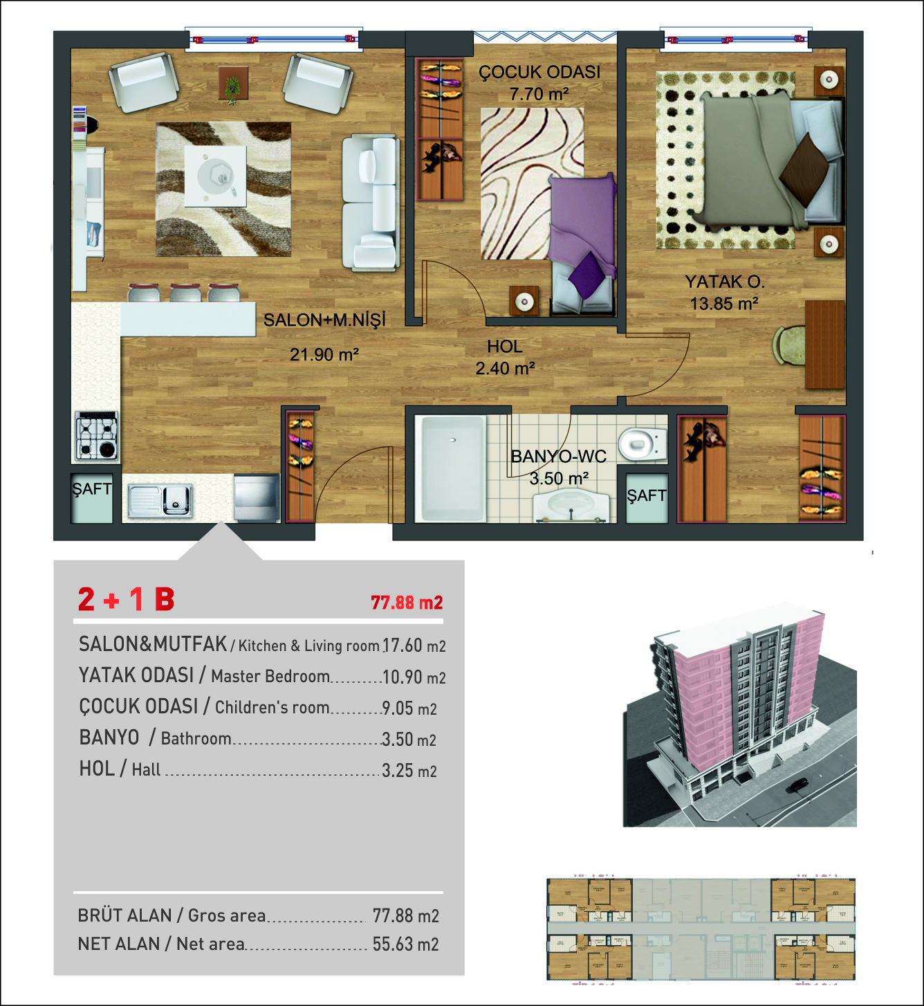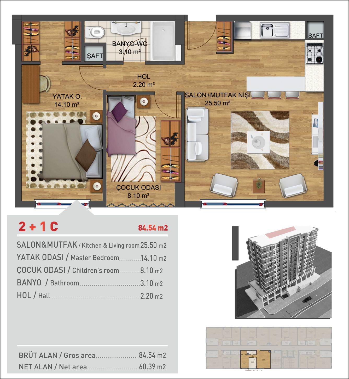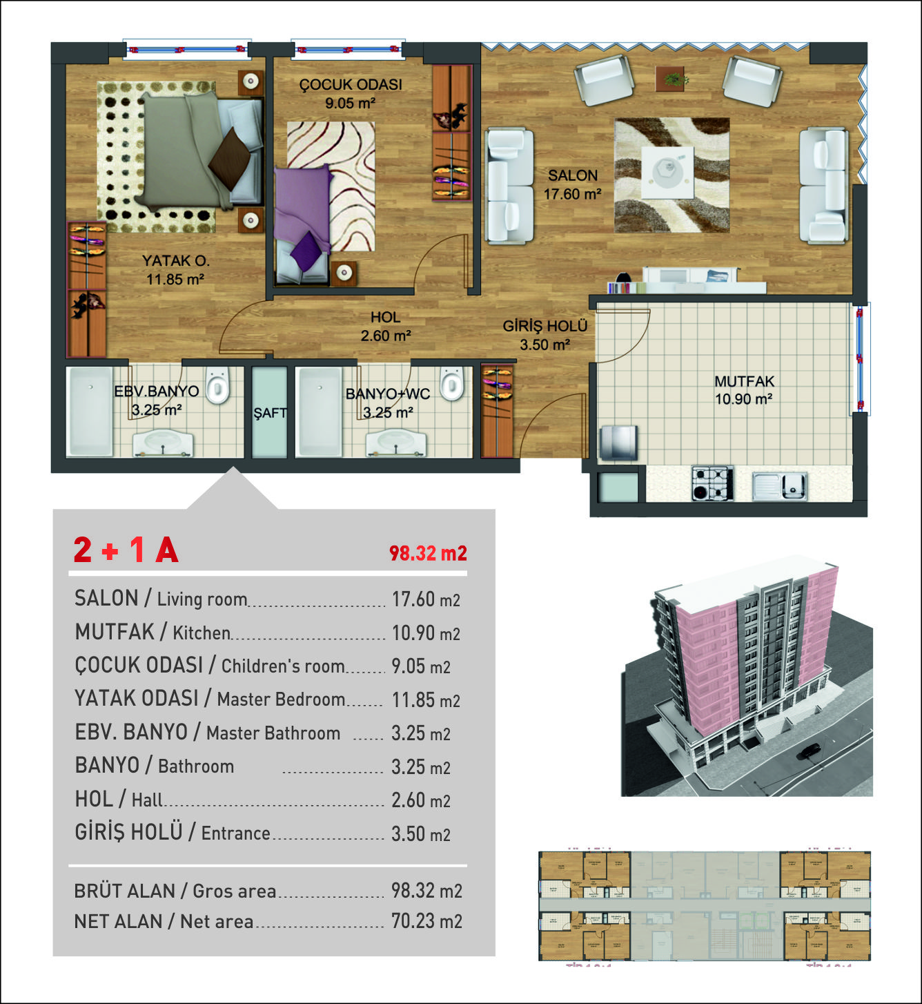 ADS Residence projesinde kapalı mutfaklı 2 oda 1 salon daireler 98,32 metrekare, açık mutfaklı 2 oda 1 salon daireler 77,88 metrekare ve 84,54 metrekare büyüklüklerle dizayn edildi.