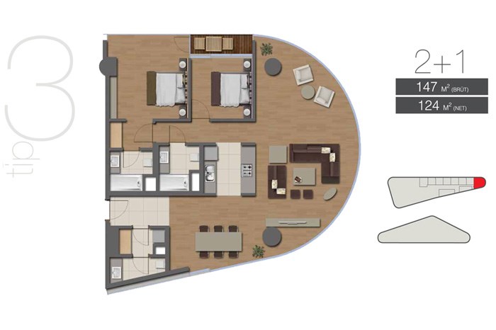 Esas Aeropark projesinde 1+1 daireler brüt 71, 79, 87, 100, 114 ve 126 metrekare net 61, 67, 74, 85, 97 ve 107 metrekare, 2+1 daireler brüt 147 metrekare net 124 metrekare büyüklüklerle dizayn edildi.