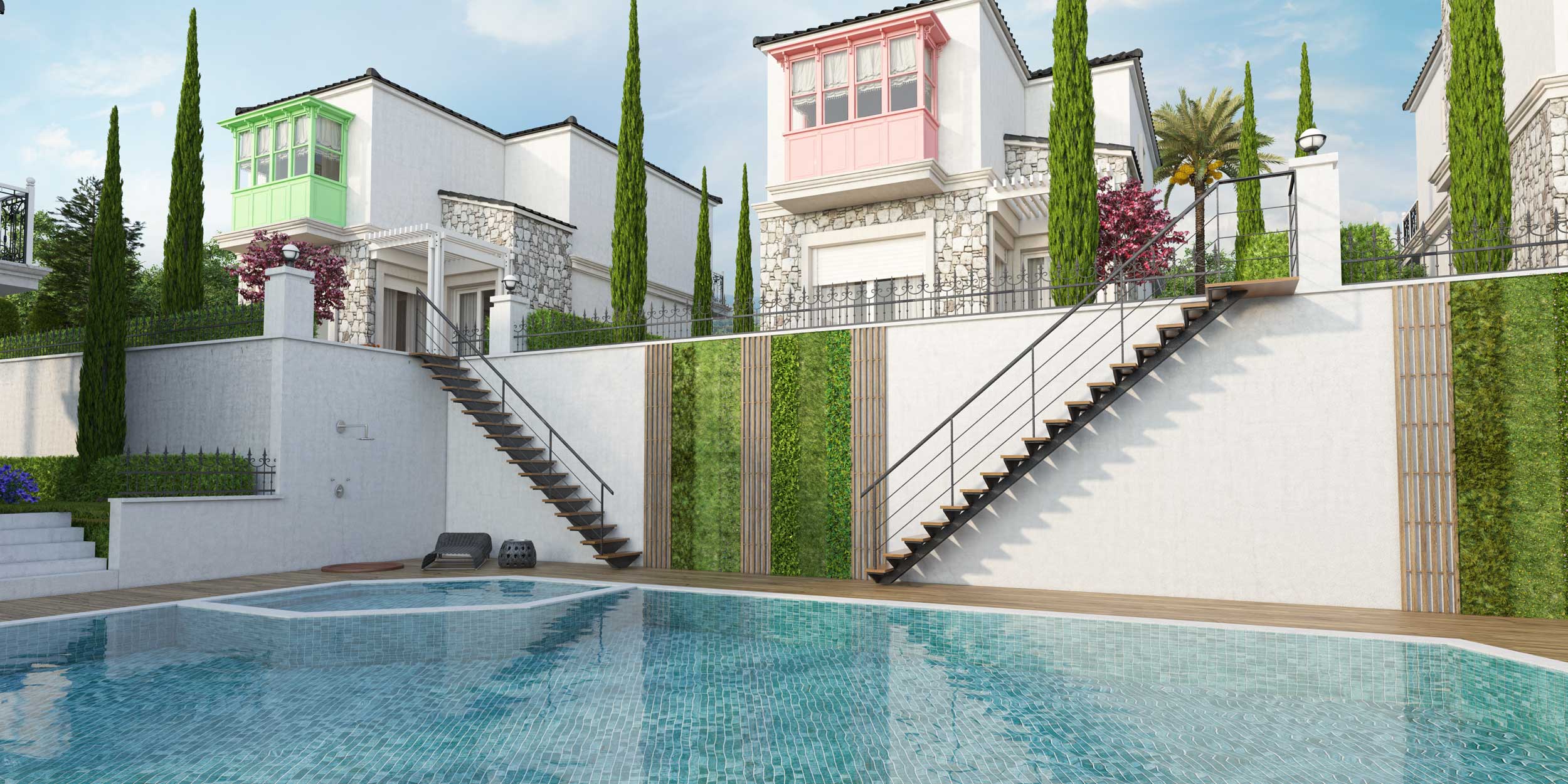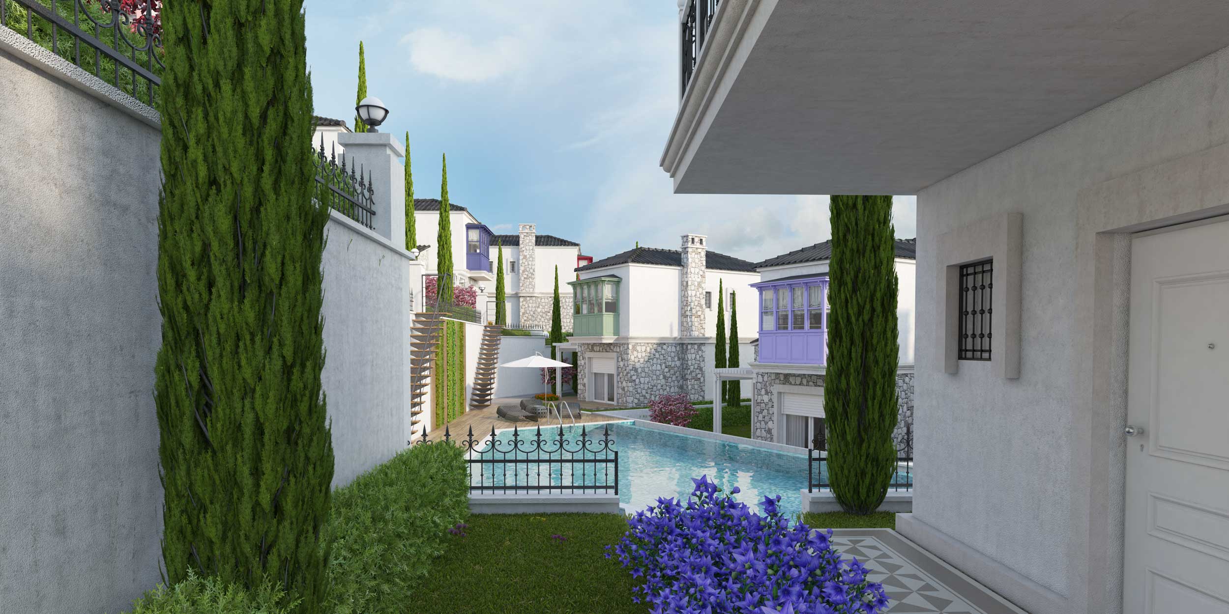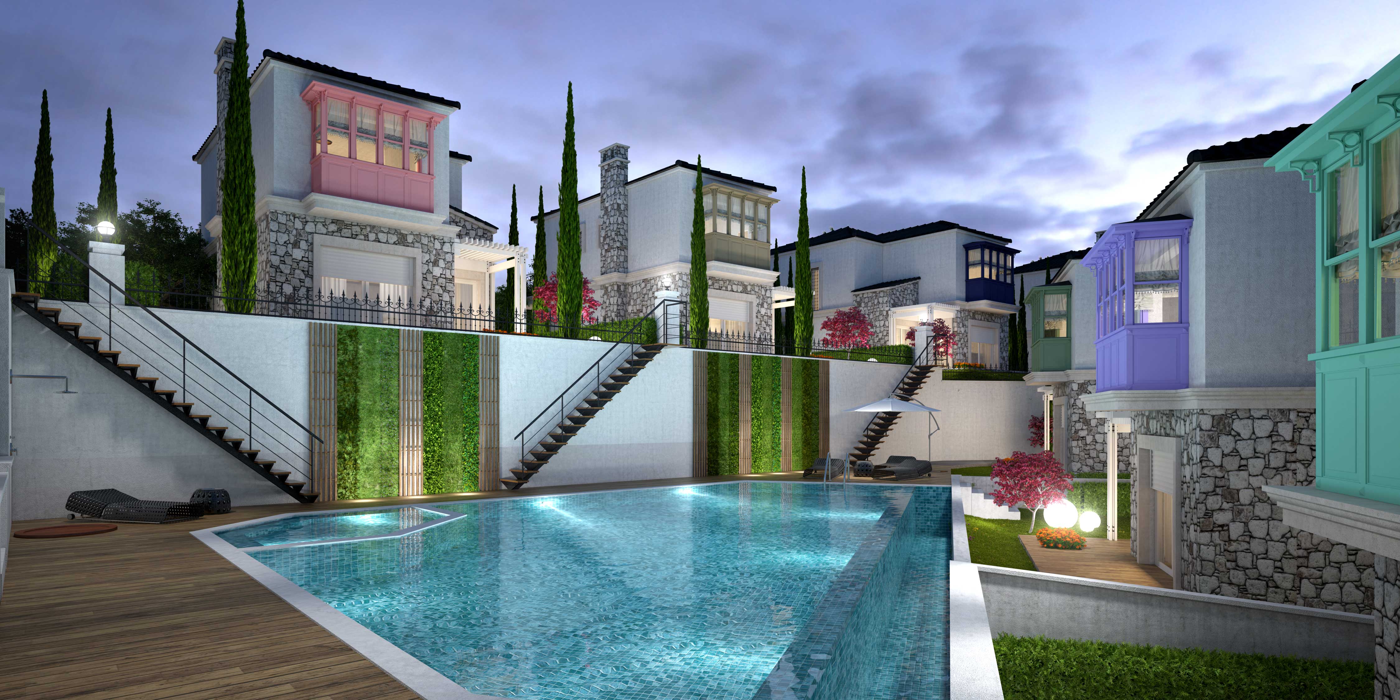 Ödüllü mimar Tuncay Gültürk’ün ilk çalışması olan proje her villada müstakil giriş, otopark yeri ve havuza ulaşımının bağımsız olması tasarlandı