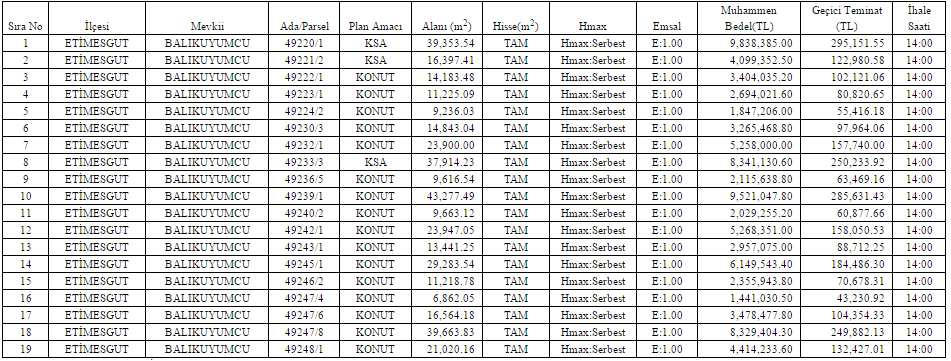 Ankara Büyükşehir Belediyesi 21 arsasını toplam 172 milyon 750 bin TL'ye satışa çıkarıyor...Ankara Büyükşehir Belediyesi Etimesgut ve Çankaya'da yer alan 21 arsasını satışa çıkarıyor. Satışa söz konusu 19 arsa Etimesgut Balıkuyumcu'da, 2 arsa ise Çankaya Dikmen'de bulunuyor.