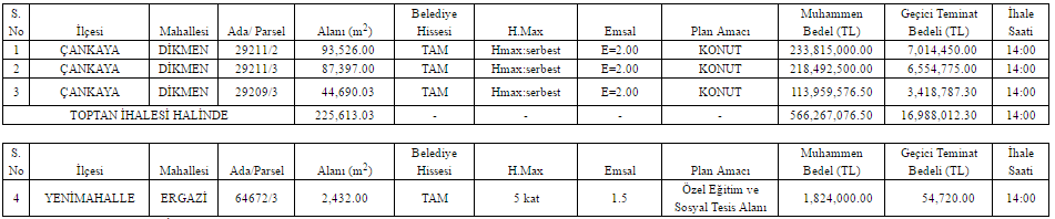 İhaleye konu olan arsaların toplam muhammen bedeli 763 milyon 63 bin 632 TL olarak belirlendi. İhaleye katılacakların bin TL karşılığında Ankara Büyükşehir Belediyesi Emlak ve İstimlak Dairesi Başkanlığı Taşınmazlar Şube Müdürlüğü'nden alınabilir.