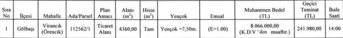 Mülkiyeti Ankara Gölbaşı Belediye Başkanlığı’na ait olan ve Gölbaşı Virancık Mahallesi’nde konumlanan arsa, 8 milyon 66 bin TL muhammen bedelle satılacak. Söz konusu satış işlemi gerçekleşecek olan Gölbaşı Virancık (Örencik) Mahallesi 112562 ada 1 parselde konumlanan ‘ticaret alanı’ imarlı arsa 4 bin 360 metrekare büyüklüğe sahip.