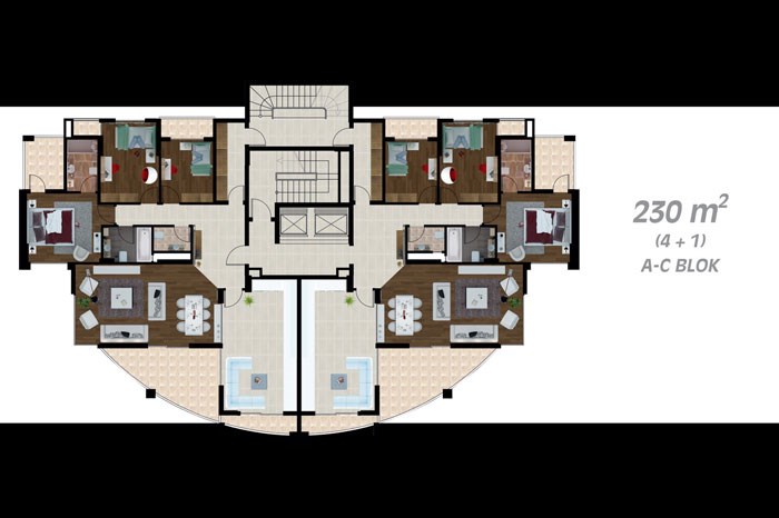 - Projenin A ve C bloklarında 240 metrekarelik, B blokta ise 280 metrekarelik daireler yer alıyor.