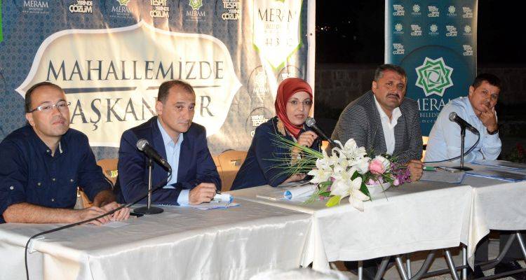 Meram Belediyesi tarafından “Mahallemizde Başkan Var” projesi kapsamında gerçekleştirilen toplantıların ilki Bacıyan-ı Meram Kültür ve Sanat Merkezi’nin bahçesinde yapıldı. Toplantıya Meram Belediye Başkanı Fatma Toru ile birlikte başkan yardımcıları, daire müdürleri, Durunday, Yorgancı ve Çandır mahallelerinin muhtarları ile vatandaşlar katıldı. 1,5 yıl içerisinde yaptıkları önemli yatırım ve hizmetleri anlatan Başkan Toru, “Meram’da imar planlarının hepsini yeniden ele aldık. Her bölgeyi kendi içinde bir cazibe merkezi olacak şekilde, ticari alanı, meydanı, okul alanı, sağlık tesisi, sosyal tesisi, parkları ve yürüyüş alanlarıyla yeniden planladık. Bunun çok önemli olduğunu düşünüyorum. Çünkü hangi bölgeye gidersek sahada karşımıza çıkan öncelikli sorun, imar planı, mülkiyet problemi ve hisseli arazilerdir. Bunların çözümüyle beraber önümüzdeki 10 yılda Meram’ın ciddi bir ivme yakalayacağına inanıyorum. Bunu hızlandırmak için Şükran Mahallesi’nde 200 bin metrekarelik bir alanı, kentsel dönüşüm alanı ilan ettik. Diğer 5 mahallemizle birlikte toplamda 1 milyon 120 bin metrekarelik bir alanda dönüşüm çalışmamız sürüyor. Normal şartlarda 5-10 yıllık dönemde yapılabilecek bir hamleyi biz 1,5 yıla sığdırmış olduk” dedi.