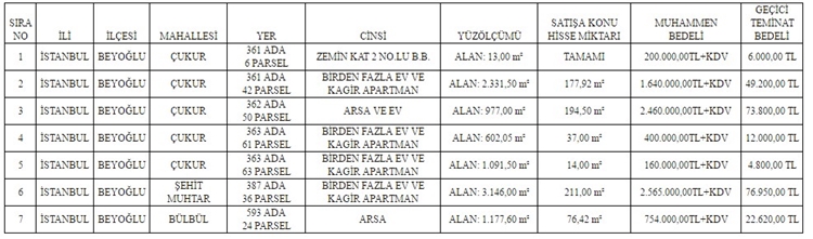 Satışa ösz konusu gayrimenkullerin toplam muhammen bedeli 8 milyon 179 bin TL+ KDV olarak belirlendi. İhale 15 Aralık 2016 gün saat 10:00'da Beyoğlu Belediyesi Encümen Toplantı Salonu'nda yapılacak.