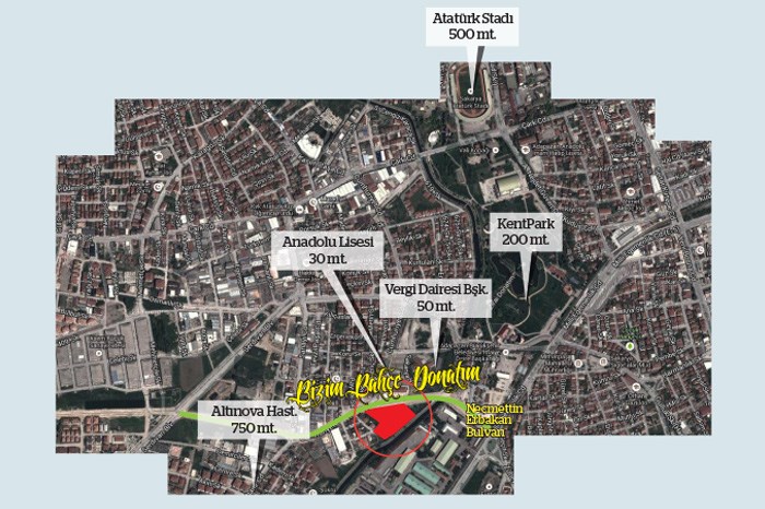 - Kent Park'a 200 metre mesafede bulunan Bizim Bahçe Donatım'ın 750 metre uzağında Altınova Hastanesi yer alıyor.