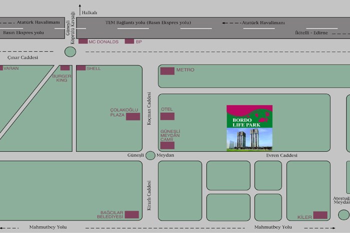 - Bordo Life Park Güneşli projesinde 60 konutun yanı sıra 15 mağaza yer alıyor. - Güneşli Bordo Life Park projesi sosyal alanları bakımından oldukça zengin. - Butik konseptte inşa edilen Bordo Life Park Güneşli projesi Atatürk Havalimanı'na 5 dakika mesafede bulunuyor. - Bordo Life Park projesi TEM, E-5 ve 212 Power Outlet AVM'ye oldukça yakın. HEMEN TESLİM En düşük ve en yüksek konut fiyatlarının 470 bin lira ile 530 bin lira arasında değiştiği Bordo Life Park Güneşli projesinde daireler banka kredisine uygun durumda. Kiraların 1500 liradan başladığı projede daire teslimleri hemen yapılıyor. Bordo Life Park Güneşli Sosyal İmkanları ve Proje Özellikleri : - Basketbol sahası - Çocuk oyun alanları - Fitness merkezi - Kamelya - Kapalı yüzme havuzu - Merkezi uydu sistemi - Sauna - Süs havuzu - Tenis kortu - Asansör - Hidrofor - Jeneratör - Su Deposu - Ankastre beyaz eşya - Isı pay ölçer - İntercom sistemi - Merkezi ısıtma - Split klima - Deprem yönetmeliğine uygun - Yalıtım yönetmeliğine uygun - Yapı denetimi yapılmış - Zemin etüdü yapılmış