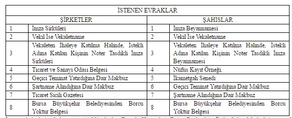 İhaleye katılmak isteyenlerden istenen belgeler şöyle: