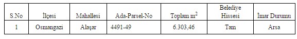 Bursa Büyükşehir Belediye Başkanlığı, mülkiyeti kendisine ait Osmangazi'de yer alan 1 adet arsa ile 1 adet pilon yerini satışa çıkartıyor...Bursa Büyükşehir Belediye Başkanlığı, Alaşar mahallesinde yer alan 1 adet arsa ile 1 adet pilon yerini satışa çıkartıyor. Belediye arsa için 5 milyon 830 bin TL, pilon yeri için 33 bin 300 TL muhammen bedel belirlemiş durumda.