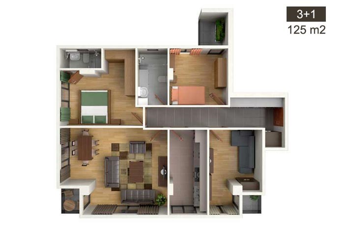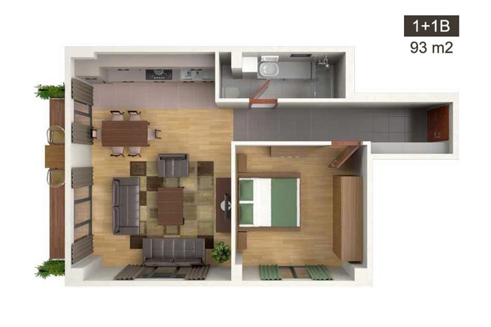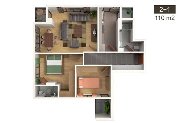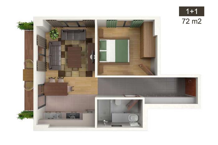 - Projede az sayıda 72-93 metrekarelik 1 oda 1 salon daireler, 110 metrekarelik 2 oda 1 salon daireler, 125 metrekarelik 3 oda 1 salon daireler bulunuyor.