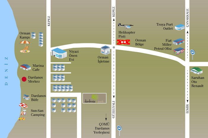 Çanakkale merkeze 7 kilometre uzaklıkta bulunan Dardanos koyunda yükselen Dardenia Park projesi denize sadece 150 metre mesafede inşa edildi. Projenin etrafı çam ormanlarıyla çevrili durumda. Boğaz ve Ege manzarasına sahip olan Dardenia Park'ta villalar aylık ve sezonluk kiralamaya uygun. Dardenia Park projesinde aylık kiraların 3 bin lira ile 4 bin lira arasında değişiyor.
