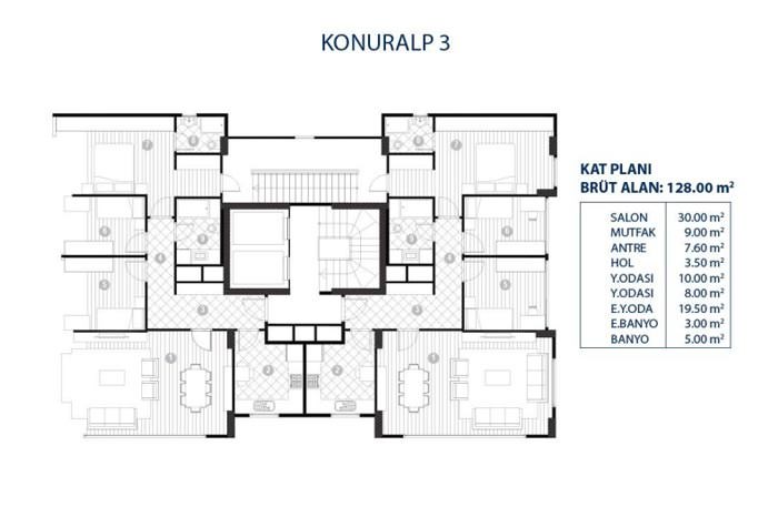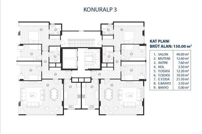 Denge Konuralp 3, 4 bin metrekare alan üzerinde tek blok halinde yükseliyor. Projede 2+1'lerin satışı tamamlanmış durumda. Satışı devam eden 3+1'ler ise 128 ile 150 metrekare arası ölçülerde değişiyor.