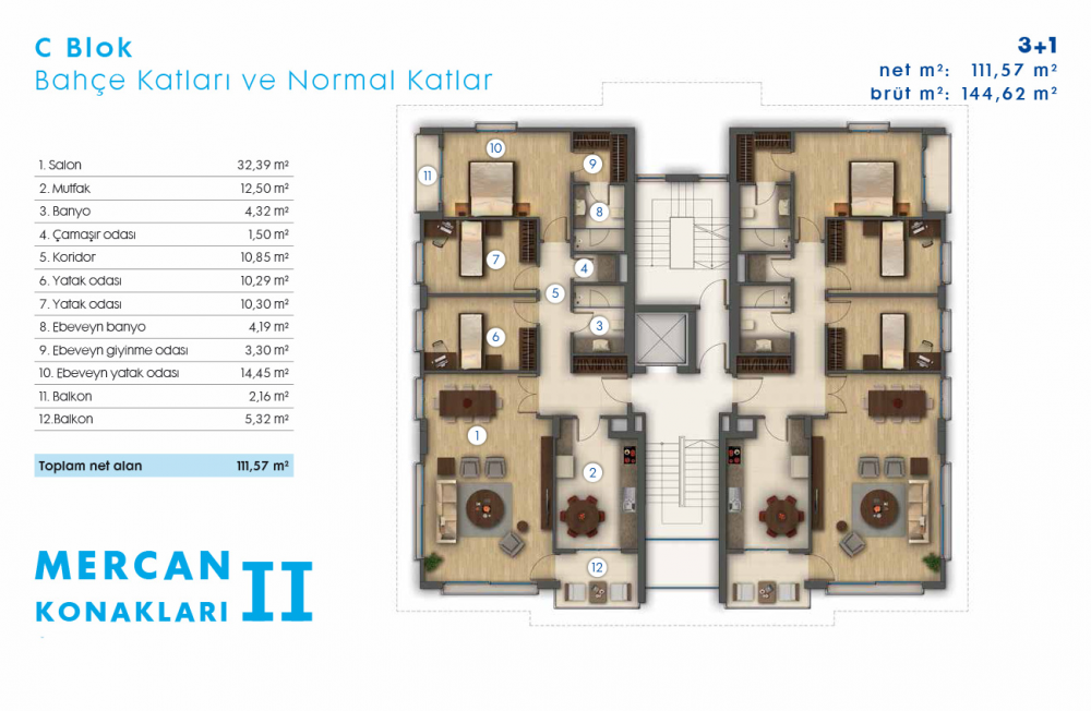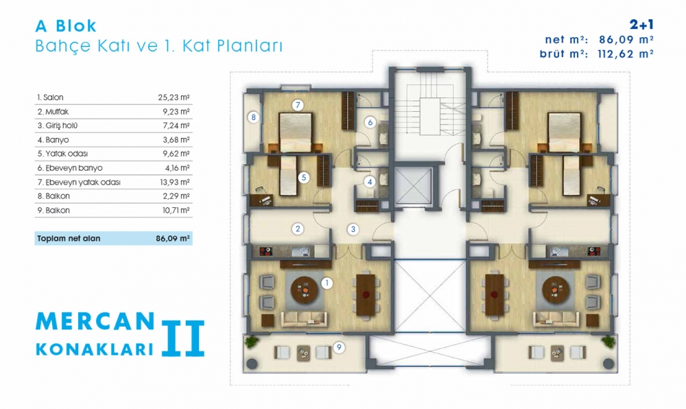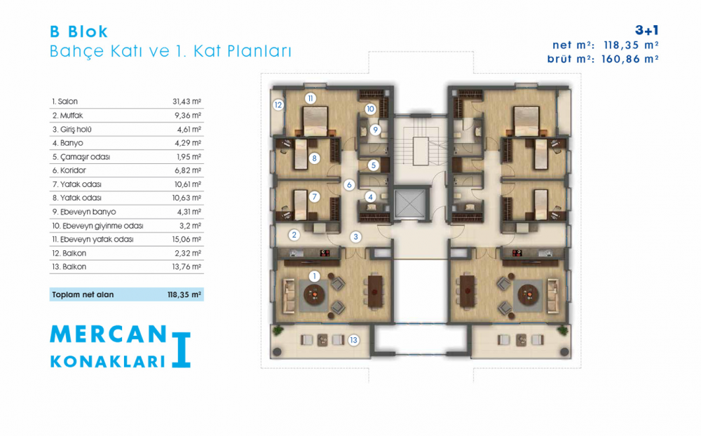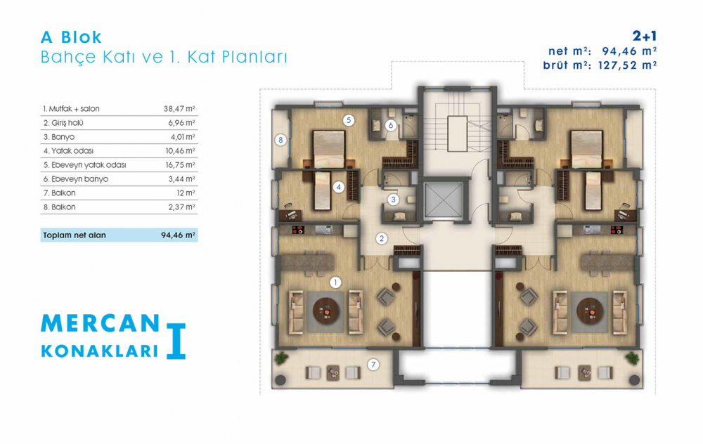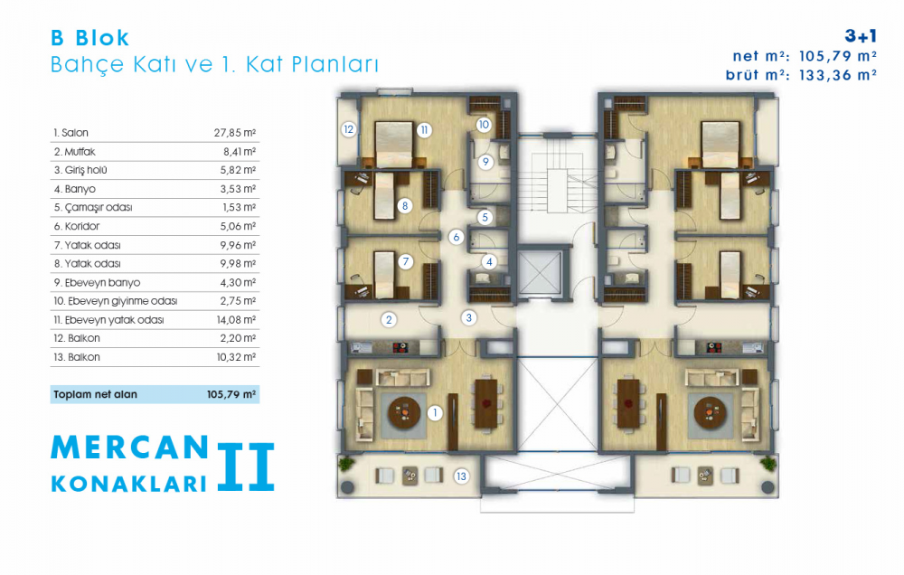 Deniz İstanbul Mercan Konakları'da kendi arasında 2 etaba ayrılıyor. 62 bin metrekare alan üzerine konumlanan Deniz İstanbul Mercan Konakları 1. etapta 368 adet daire yer alıyor. Dört katlı blokların yer aldığı etapta 2+1, 3+1 ve 4+1 daire seçenekleri yer alıyor. Bu etapta teslimlerin Kasım 2017'de yapılması planlanıyor.