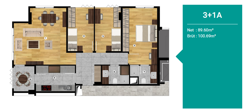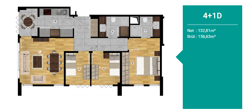 DKY Cadde Suadiye 12 projesinde 3 oda 1 salon daireler brüt 100,69 metrekare net 89,60 metrekare, 4 oda 1 salon daireler ise brüt 156,63 metrekare net 132,81 metrekare büyüklüklerle dizayn edildi.