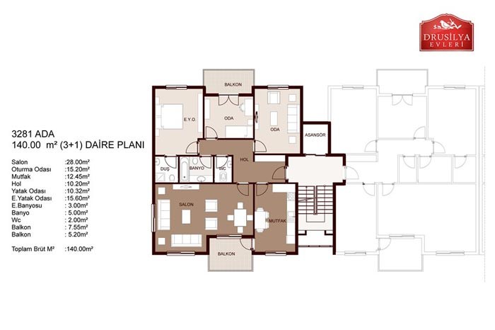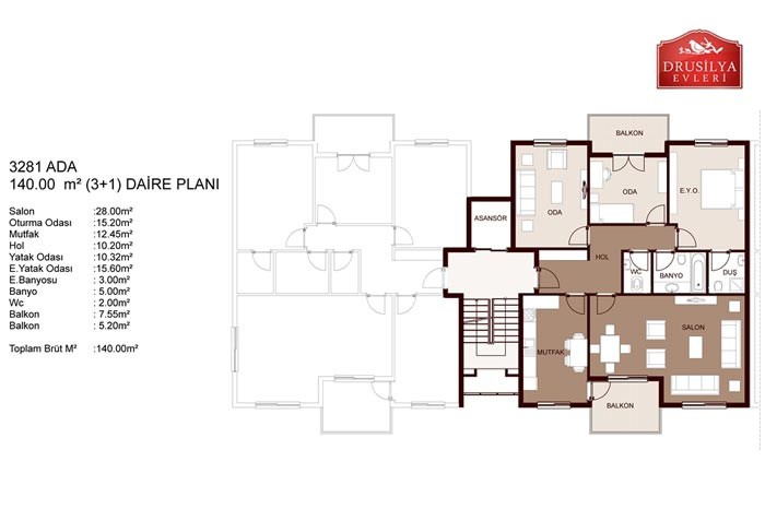 Eskişehir'in Tepebaşı bölgesinde AYD Yapı tarafından 38 bin metrekarelik alanda 174 konut kapasitesi ile inşa edilen Drusilya Evleri projesinde büyüklükleri 140 ile 230 metrekare arasında değişen 3 oda 1 salon ve 4 oda 1 salon konut tipi seçenekleri sunuluyor.