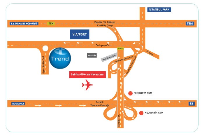 - TEM ve E-5 karayolları arasında bulunan Trend Kurtköy, Sabiha Gökçen Uluslararası Havaalanı'na 5 dakikalık mesafede yükseliyor.