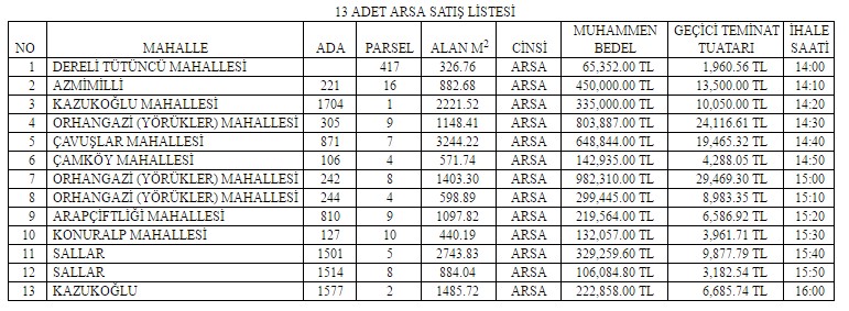 Başkanlığın ihaleye çıkarttığı arsalar; Dereli Tütütncü, Azmimilli, Kazukoğlu, Orhangazi (Yörükler), Çavuşlar, Çamköy, Arapçiftliği, Konuralp, ve Sallar mahallelerinde yer alıyor.