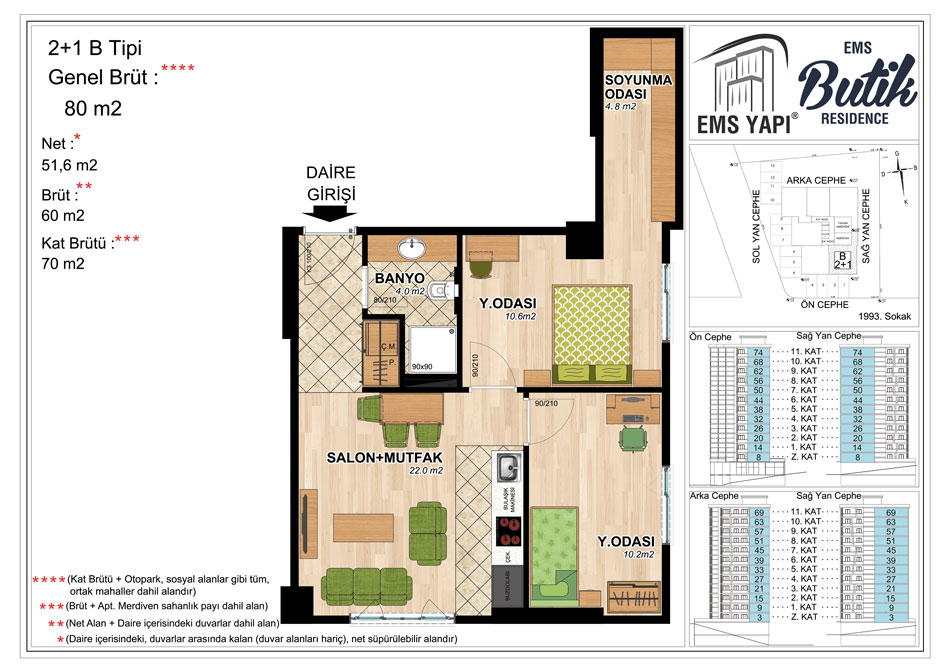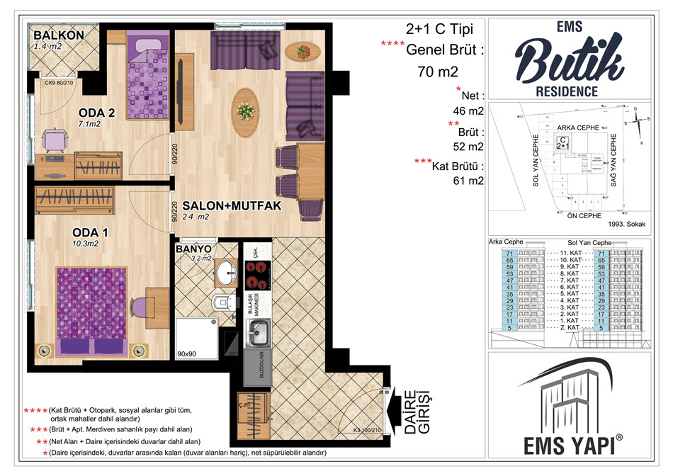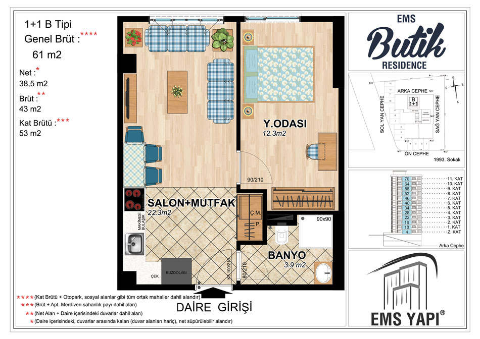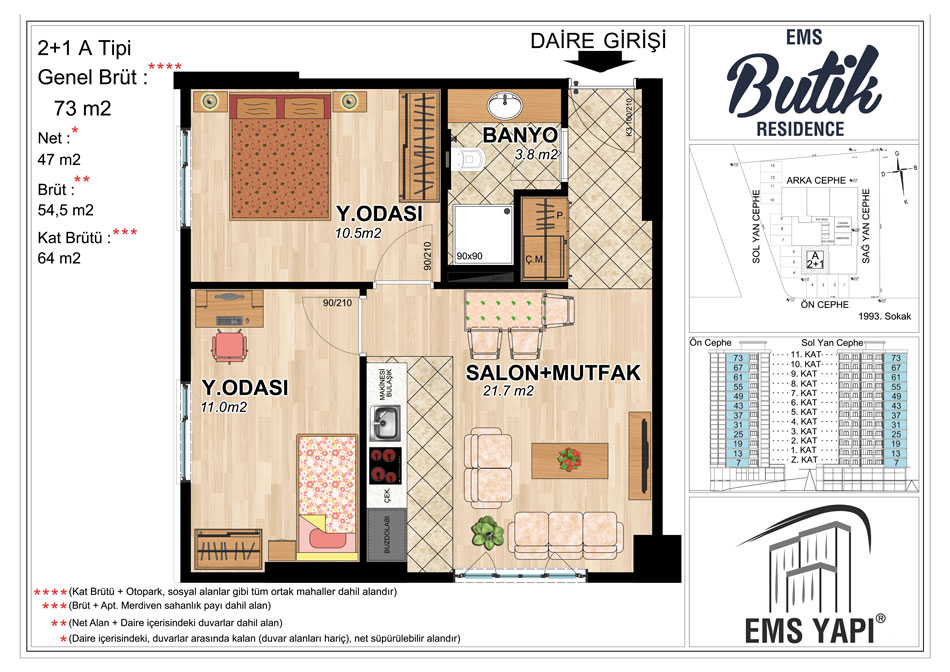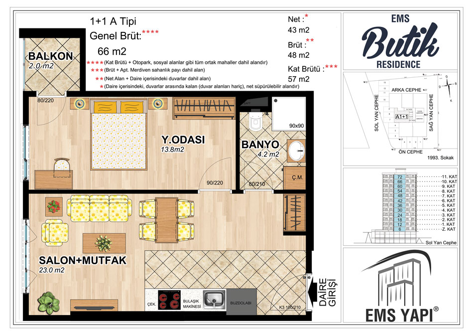 Toplam 72 adet konuttan meydana gelen EMS Butik Residence projesinde konutların yanı sıra 2 ticari alan bulunuyor. Proje 61 ve 66 metrekarelik 1 oda 1 salon, 70, 73 ve 80 metrekarelik 2 oda 1 salon daire seçenekleri yer alıyor.