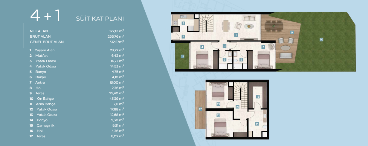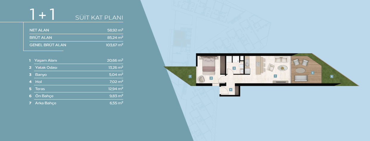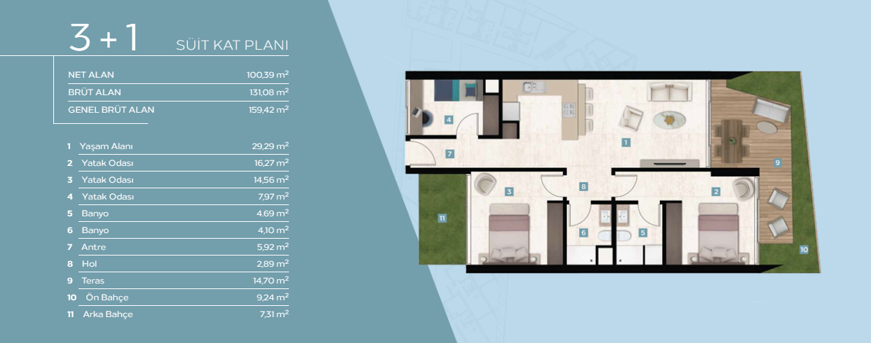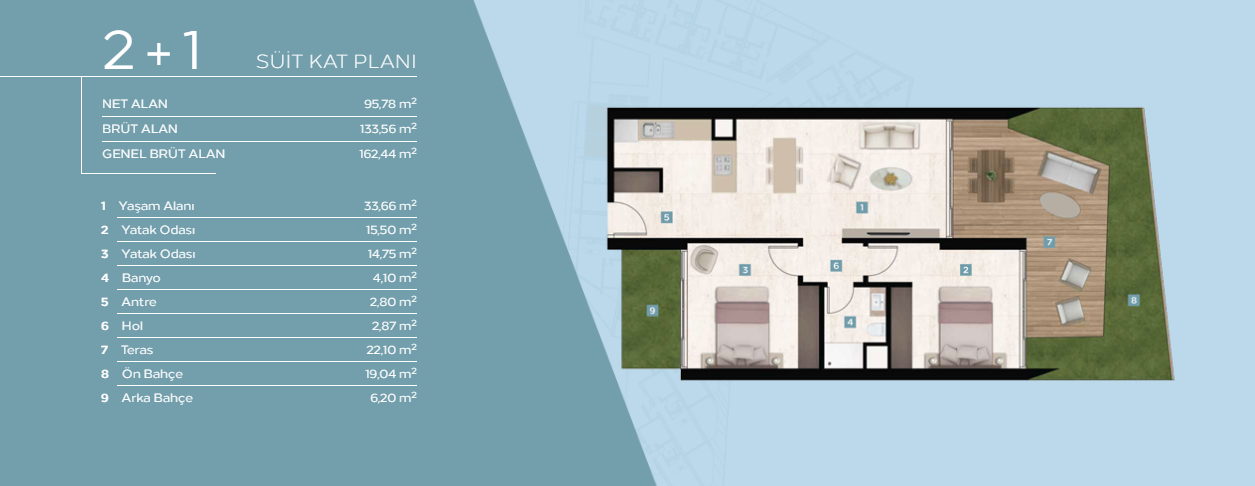 Folkart Blu Çeşme projesinde 1+1 daireler 61 ila 273 metrekare, 2+1 daireler 111 ila 305 metrekare, 3+1 daireler 147 ila 320 metrekare, 4+1 dubleksler ise 270 ila 312 metrekare alanlarla dizayn edildi.