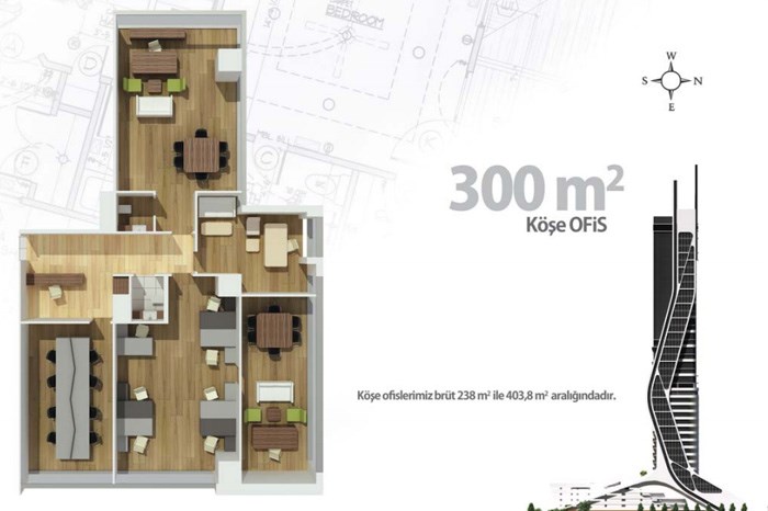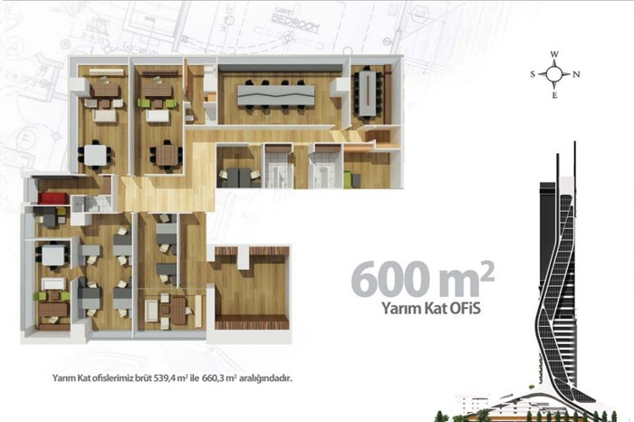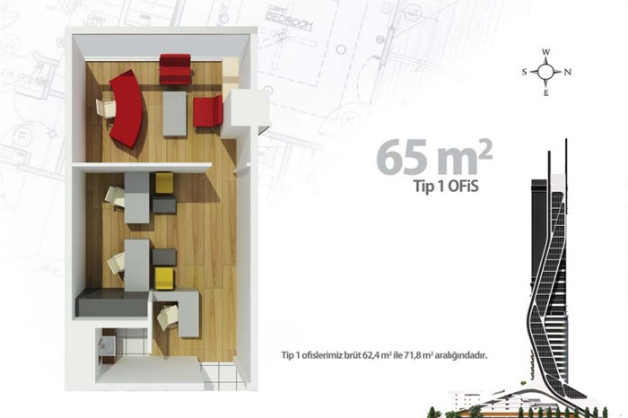 Folkart Towers'ın birinci kulesinde 29. ve 43. katlarda yer alacak ofiste sadelik ve kalite ön planda tutuldu. 29. katta satış ofisi, müşteri hizmetleri, bilgi işlem ve insan kaynakları departmanları, 43'üncü katta ise yönetici ofisleri, teknik ofis ve dizayn ofis yer alacak.