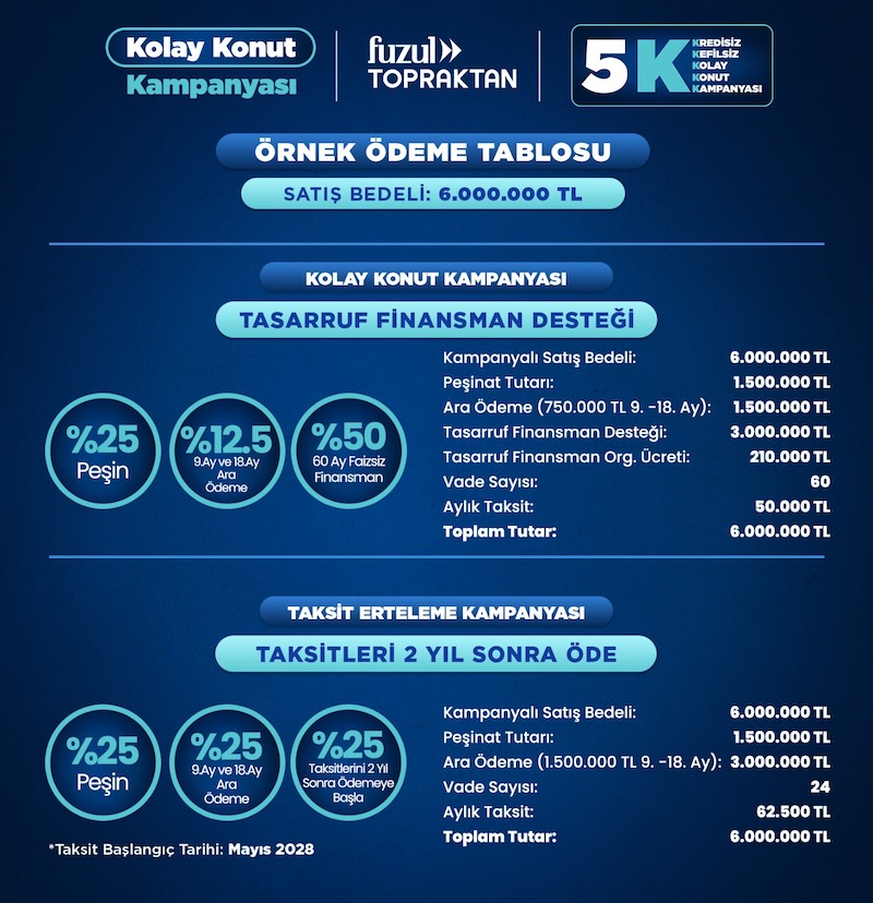 Fuzul Topraktan’ın “Kefilsiz, Kredisiz, Kolay Konut Kampanyası” (5K); Başakşehir, Ispartakule ve Pendik’te inşası devam eden seçili projeleri kapsıyor. Kampanya kapsamında konut bedelinin yüzde 25’i peşinat olarak ödenirken, 9. ve 18. aylarda yapılacak ara ödemelerle birlikte toplam tutarın yarısı Fuzul Topraktan tarafında tamamlanıyor. Kalan yüzde 50’lik tutar ise tasarruf finansman sistemi aracılığıyla 60 aya varan taksit imkanıyla faizsiz şekilde finanse ediliyor.