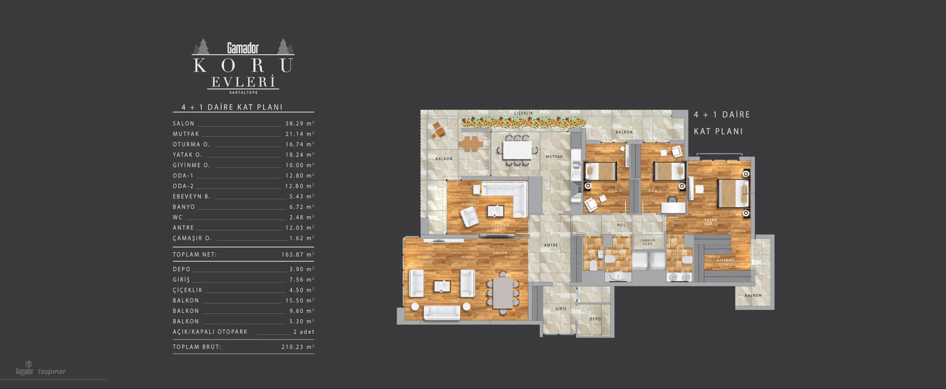 Gamador Koru Evleri Kartaltepe'de dairelerin tamamı 4 oda 1 salon şeklinde dizayn edildi. Projedeki dairele brüt 210,23 metrekare, net 163,87 metrekare olarak belirlendi.
