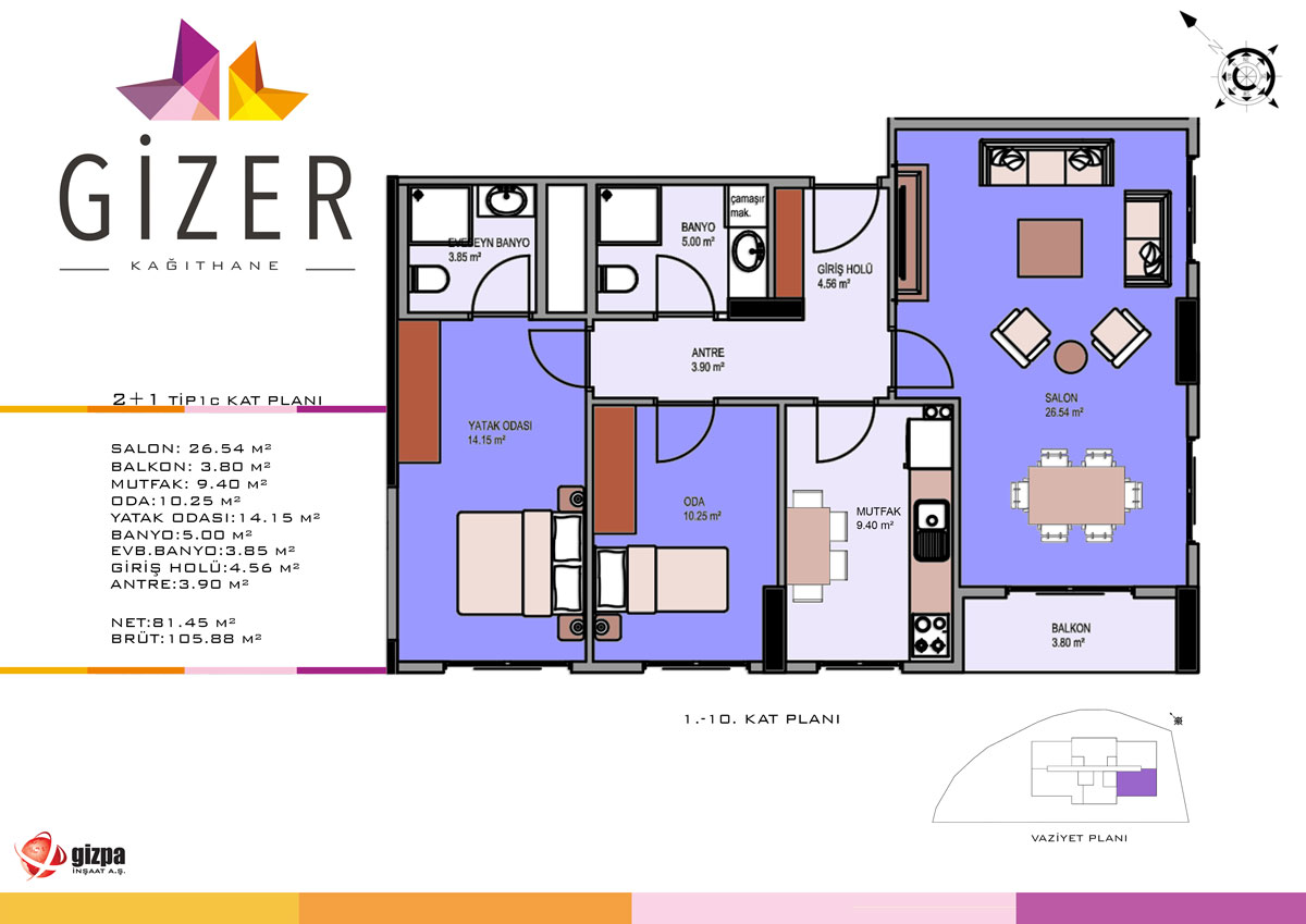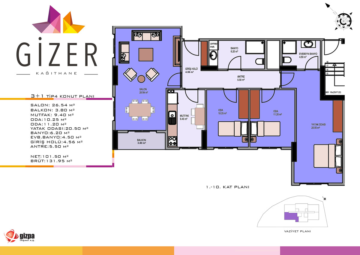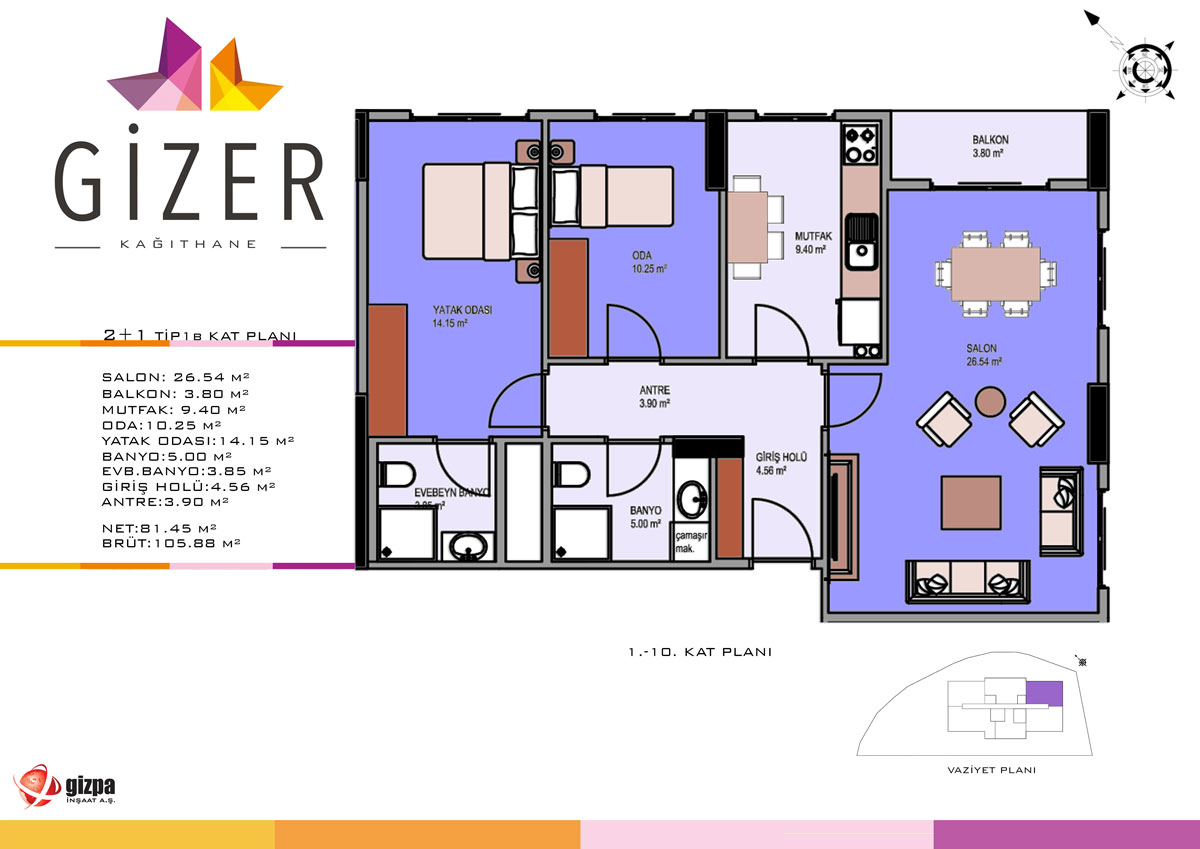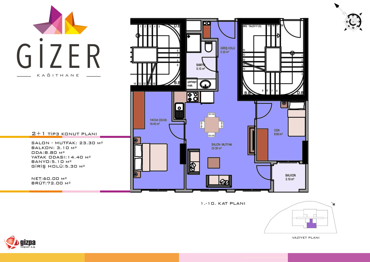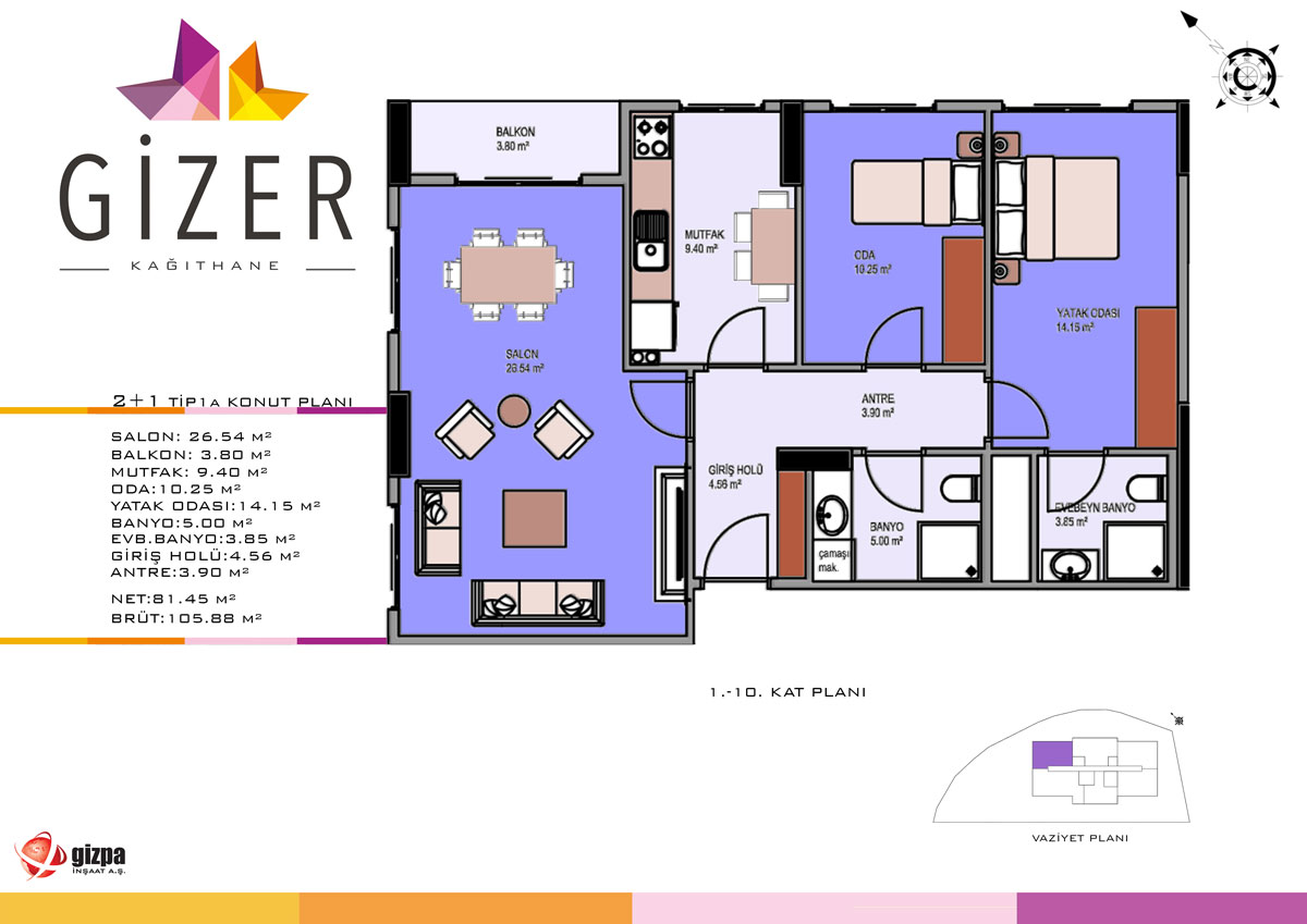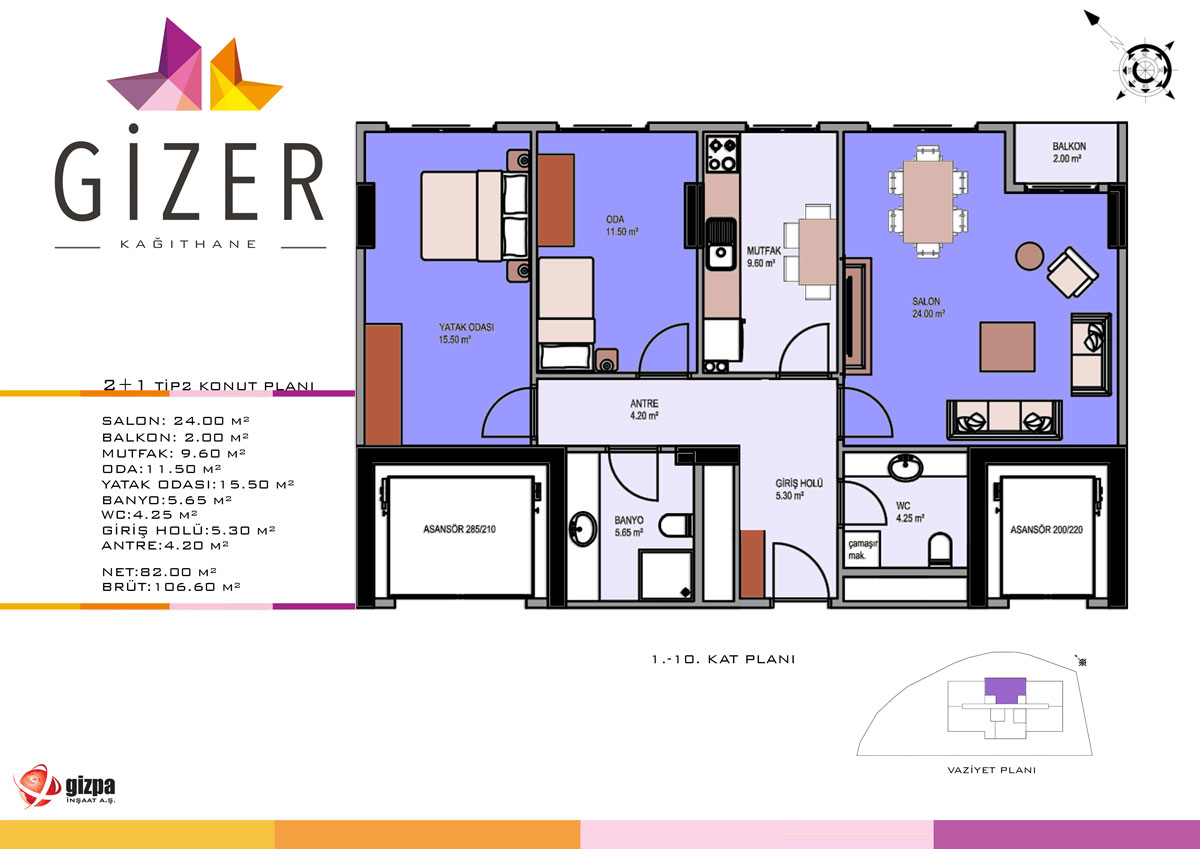 Gizer Kağıthane projesinde 2 oda 1 salon daireler brüt 105,88 net 81,45 metrekare, brüt 106,60 net 82 metrekare ve brüt 72 net 60 metrekare, 3 oda 1 salon daireler brüt 131,95 net 101,50 metrekare büyüklüklerle dizayn edildi.