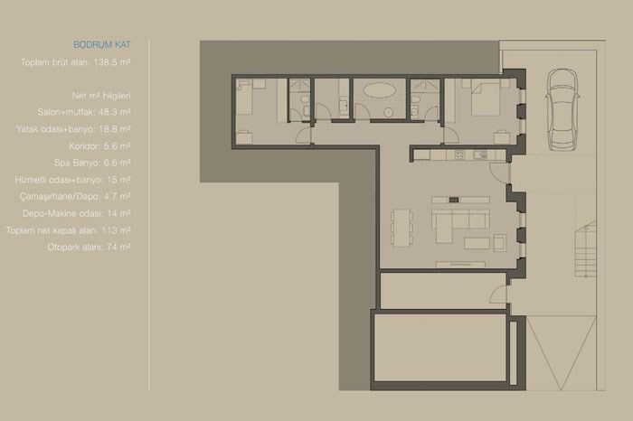 - 508 metrekarelik villalarda 4 oda, 2 salon, 4 banyo ve 2 mutfak bulunuyor.