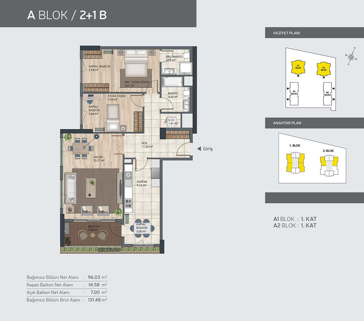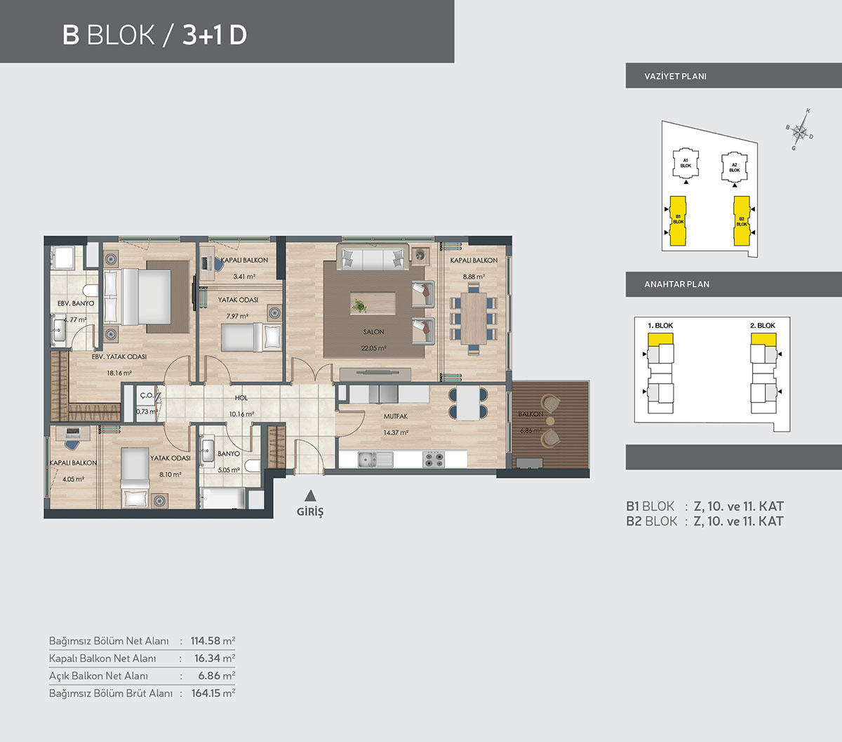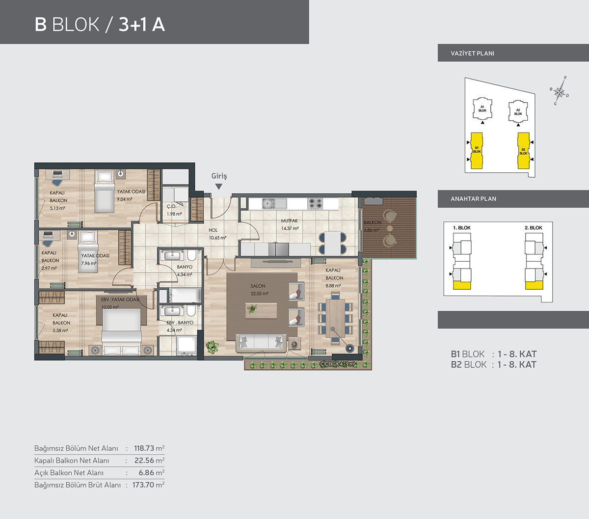 Güneşbahçe Evleri projesi 1 oda 1 salon, 2 oda 1 salon ve 3 oda 1 salon daire tiplerinde dizayn edildi. Projede 1+1 daireler 49 ve 50 metrekare, 2+1 daireler 93, 94, 96, 97 ve 98 metrekare, 3+1 daireler 114, 118 ve 119 metrekare büyüklüklere sahip.