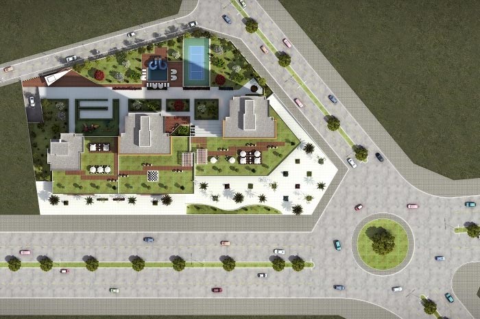 - Projenin ortak alanları arasında açık yüzme havuzu, güneşlenme alanları, çocuk oyun alanları ve spor alanları yer alıyor.