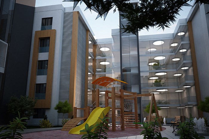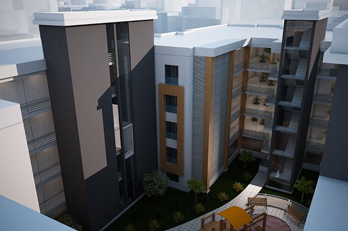- Eyüp Alibeyköy'de hayata geçirilen Haliç Rezidans'ın en önemli özelliklerinden birisi; avlu etrafında toplanan konutlar çift cepheye hâkim olup hem caddeye hem de avlu içine bakması...