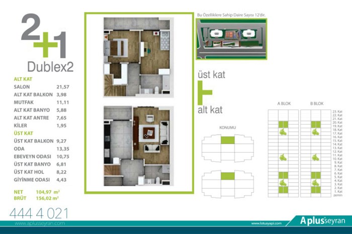 Lotus Yapı tarafından Diyarbakır Aziziye Mahallesi bölgesinde 20 bin 300 metrekare arsada 1+1, 2+1, 3+1 ve 4+1 daire seçenekleri ile yükselen A Plus Seyran projesinde dairelerin metrekare türünden büyüklükleri 65 ile 188 metrekare arasında değişiyor.