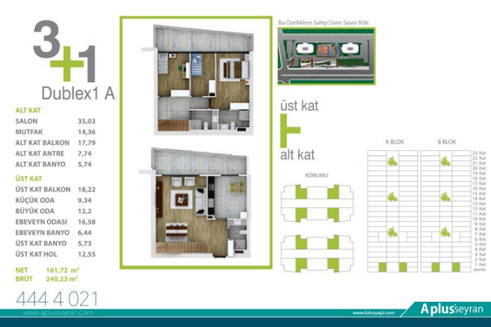 316 daireden oluşan A Plus Seyran projesi 23 katlı 2 blokta yükseliyor ve 13 bin 300 metrekaresi yeşil alana ayrılıyor.
