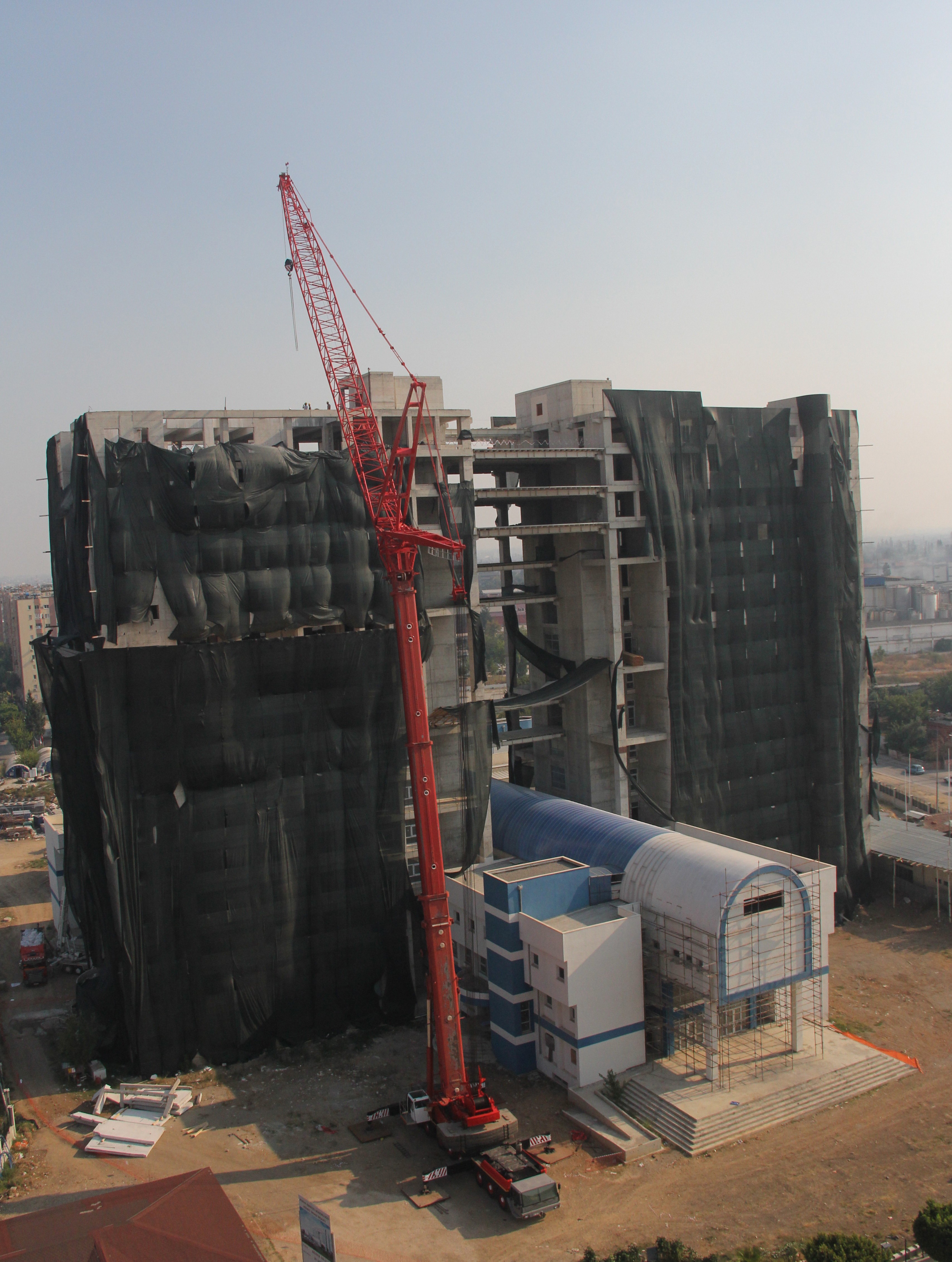 5 yıl önce inşasına başlanan 14 katlı Adana Emniyet Müdürülüğü Yeni Hizmet binasındaki 6 katın yıkımına başlandı.
