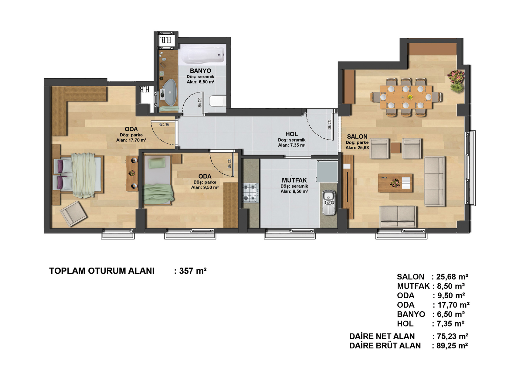 Tamamı 72 metrekare 1+1 daire tiplerinden oluşan proje 14 katlı tek bloktan meydana geliyor, yüzde 30 peşinat ve kalanı 40 ay vadeli ödeme seçeneği sunuluyor.
