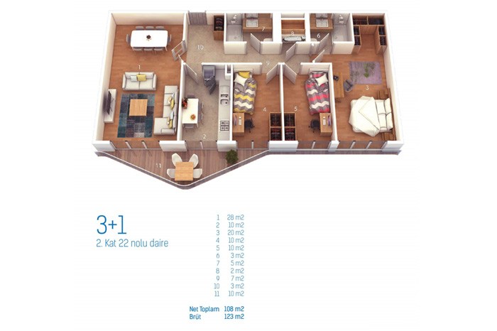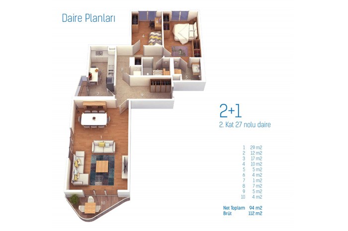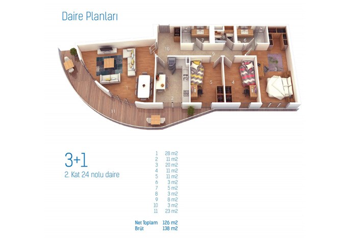 Alya Park Pendik projesinde 2+1 daireler brüt 112 metrekare, net 94 metrekare, 3+1 daireler brüt 123 ve 138 metrekare, net 108 ve 126 metrekare alanlarla dizayn edildi.