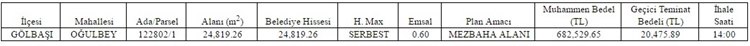 Belediyenin mülkiyeti kendisine ait olan arsa Gölbaşı ilçesi Oğulbey mahallesinde yer alıyor.