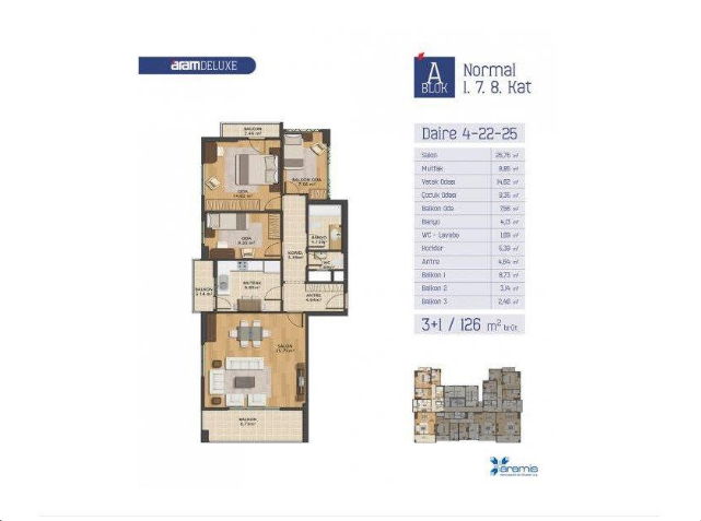 Toplam 52 adet konuttan meydana gelen Aram Deluxe projesinde alanları 112 ila 240 metrekare arasında değişen 2 oda 1 salon, 3 oda 1 salon, 4 oda 1 salon, 5 oda 2 salon dubleks ve 6 oda 2 salon dubleks daire seçenekleri yer alıyor.