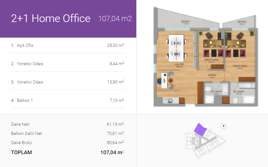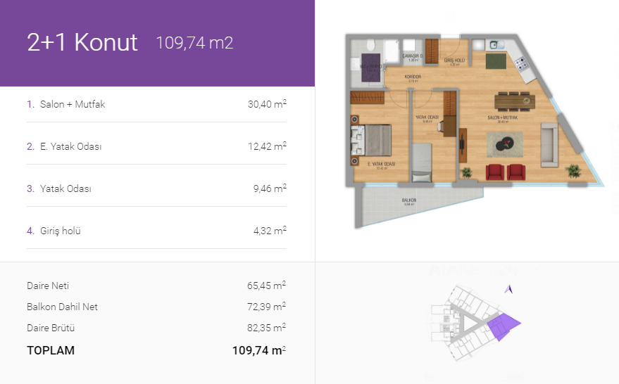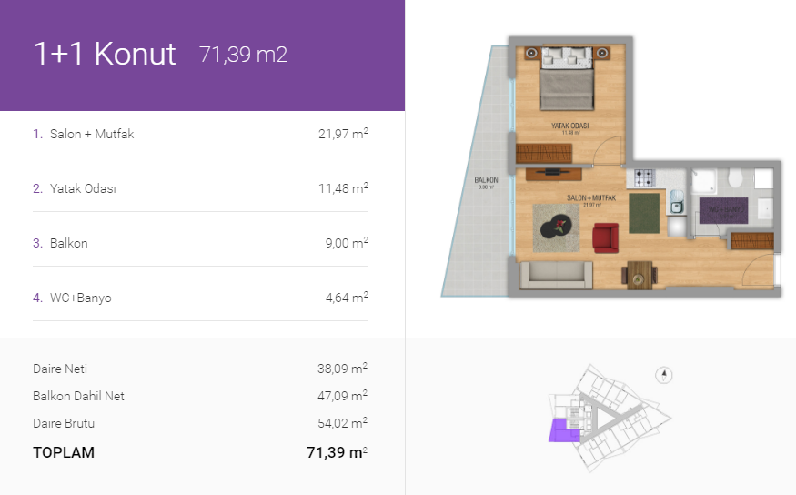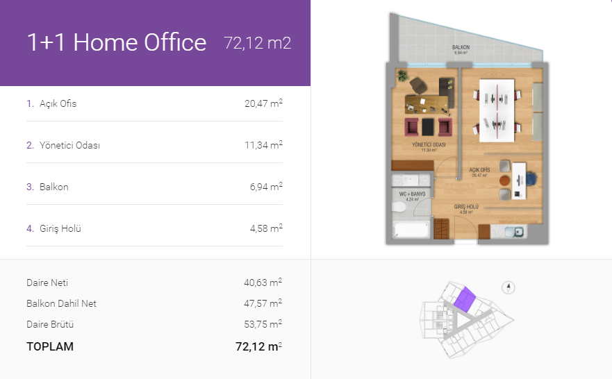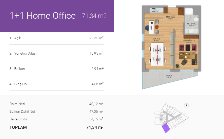 Atakent 24 projesinde 1+1 konutlar 71,39 ve 72,68 metrekare, 1+1 home ofisler 71,34 ve 72,12 metrekare, 2+1 konutlar 109,74 metrekare ve 2+1 home ofisler 107,04 metrekare alanlarla dizayn edildi.