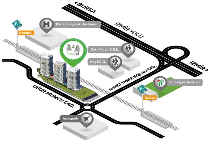 Ahmet Taner Kışlalı Bulvarı üzerinde yükselen Biaport Özlüce projesi Özlüce ve Ertuğrul metro durkaklarına Dörtçelik Çocuk Hastalıkları Hastanesi'ne, Bursaspor Tesisleri'ne, Ardıçpark'a ve İzmir Yolu'na yakın mesafede konumlanıyor.