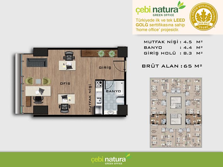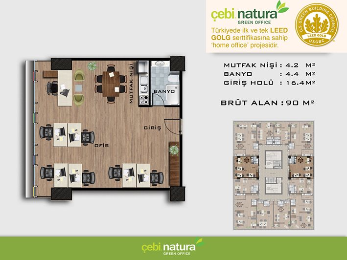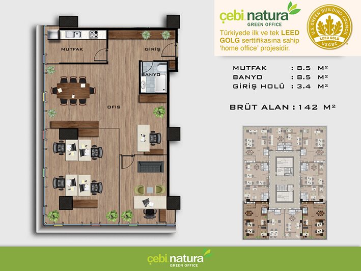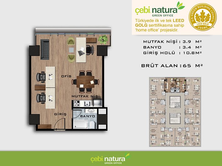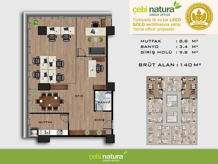Ayrıca projede tek katı komple birleştirerek bin 200 metrekarelik bir çalışma ortamı da yaratılabiliyor. Çevreci konseptte tasarlanan Çebi Natura projesinin ortak alanlarında yüzde 38 enerji tasarrufu sağlanıyor.