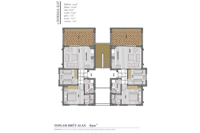 - 10 blok halinde 40 konuttan oluşan projede konutların tamamı 85 metrekare 2 oda 1 salon şeklinde tasarlandı,